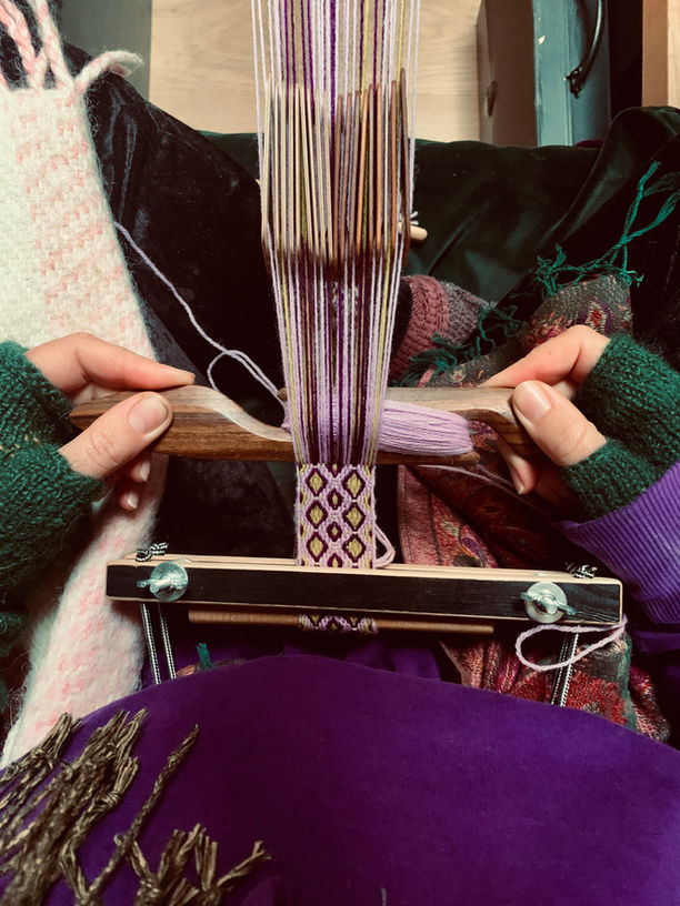 Durch das Drehen einzelner Webkärtchen entstehen komplexe Strukturen und rhythmische Muster, die sowohl funktional als auch dekorativ sind. Im Zentrum steht die Auseinandersetzung mit dieser traditionellen Technik und ihre Übertragung in einen zeitgenössischen Kontext. Historische Ornamente werden analysiert, abstrahiert und neu interpretiert. Dabei entstehen moderne Muster mit klaren Linien, reduzierten Farbpaletten und grafischem Charakter.
